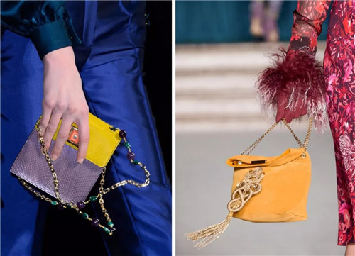 偶尔想增加亮点的,可以选设计特别的,但要在款式和颜色之间取一个平衡。看下面两个包包,虽然颜色都挺明亮,但款式分别是经典的方形包和翻盖包,既有亮点又十分百搭。